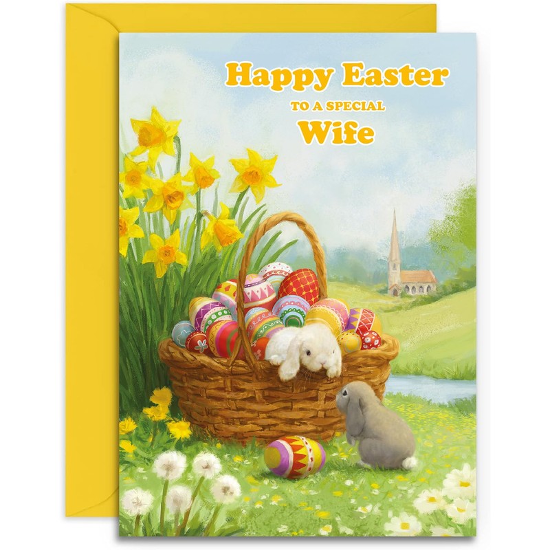 Wife Easter Card - Hoppy Easter - Medium Sized Card (A5 Size -148mm x 210mm) with Yellow Envelope