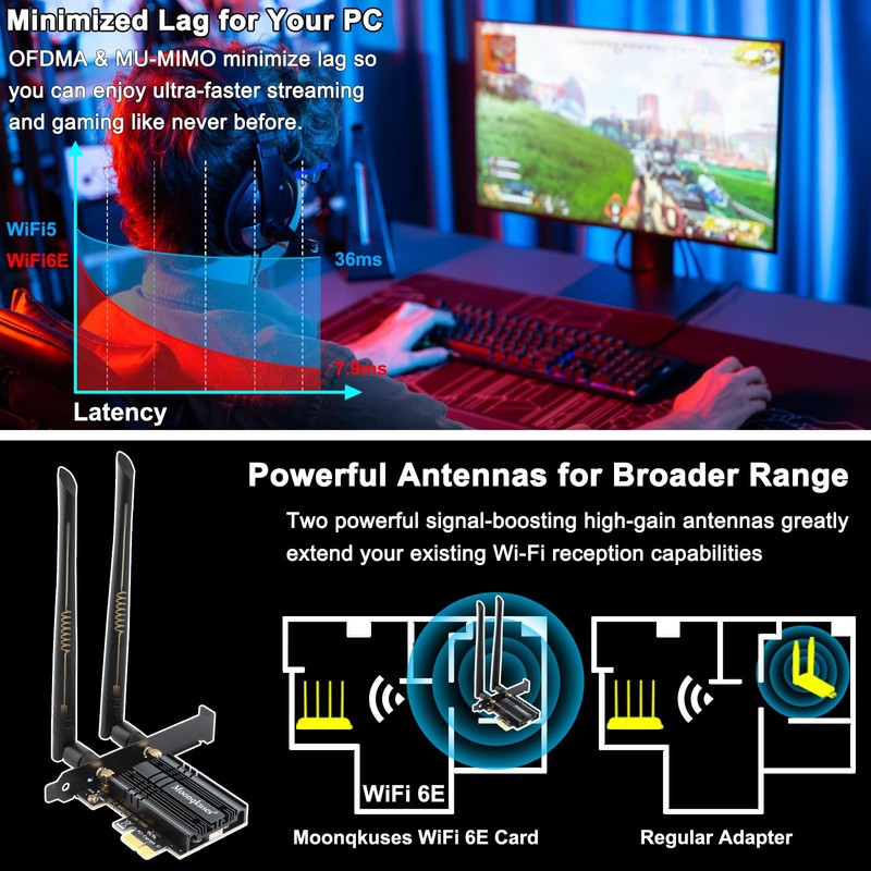 - đăWiFi Card with Bluetooth 5.3ăThe Moonqkuses AX210S wifi adapter is equipped with the latest Bluetooth 5.3 technology, achieves 2x faster speeds and 4x broader coverage compared to Bluetooth 4.2 so you can connect your favorite devices such as game controllers, headphones, and keyboards for the ultimate setup. (Warm Tips: Please note that to use the Bluetooth function, the Bluetooth USB cable must be connected to the 9-pin F_USB connector)