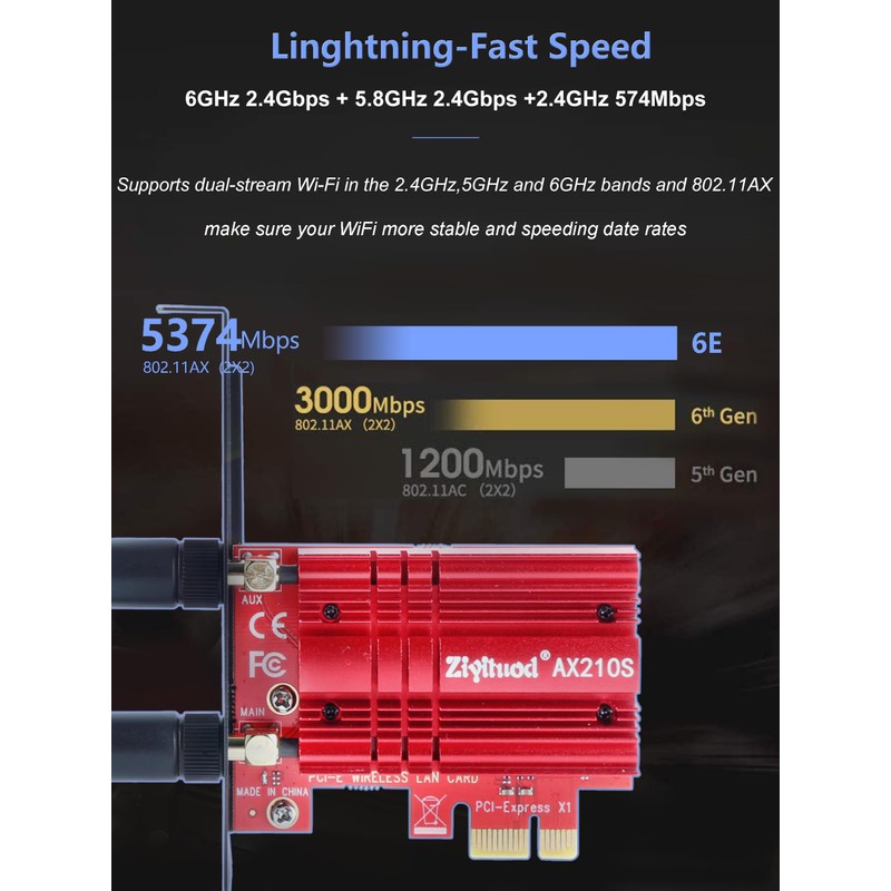 - ➤WiFi 6E Card Support 6GHz --- The PCIE WiFi 6E Card Built-in Intel AX210 chipset provides the latest 802.11ax standard technology. Delivers from 80MHz to 160MHz higher peak data rates up to 2.4Gbps, and up to 4X capacity improvement comparing to 802.11ac.