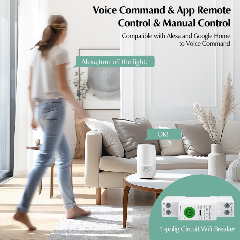 - Voice command control: our smart circuit breaker is compatible with the voice control of Amazon Alexa and Google Assistant, you can turn your devices on or off by voice command