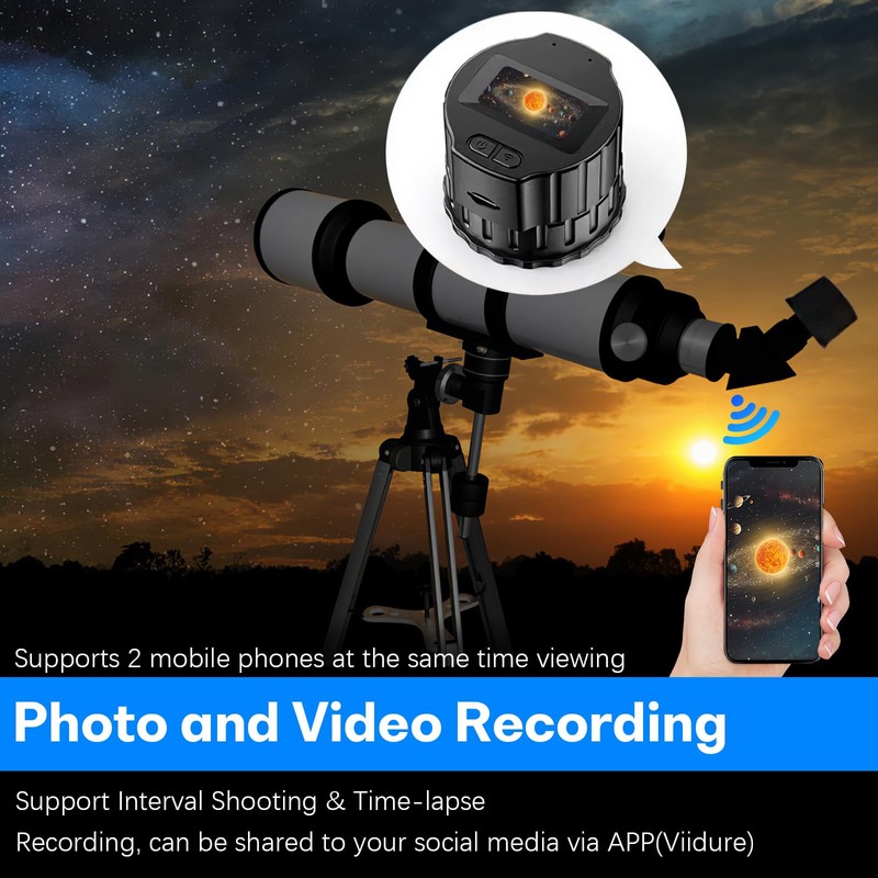 - Upgraded WiFi Function: Still bothered by eye strain caused by looking through binoculars with your eyes? You need one wireless telescope eyepiece! This digital telescope camera comes with WiFi function, you don’t have to plug in a cable anymore while using. Just simply connect to APP ‘Viidure’ from your phone to browse and control. Go photographing stunning views of planets with friends, family, and astronomy enthusiasts