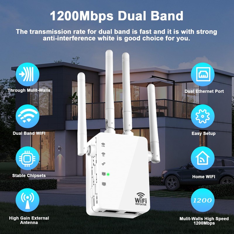 - 【1200Mbps Dual Band Gives 360° Full Coverage Signal】:This WiFi extender signal booster with all-new dual band technology can provide up to 300Mbps for 2.4GHz, up to 867Mbps for 5Ghz, totally rate of about 1200Mbps. This WiFi extender can expand the existing wireless network to hard to reach areas,covering up to 360 degrees, up to 8500 square feet and 55+ devices and farthest reduces the loss of data transmission, creating a stable network for you to enjoy fast speeds internet mode.