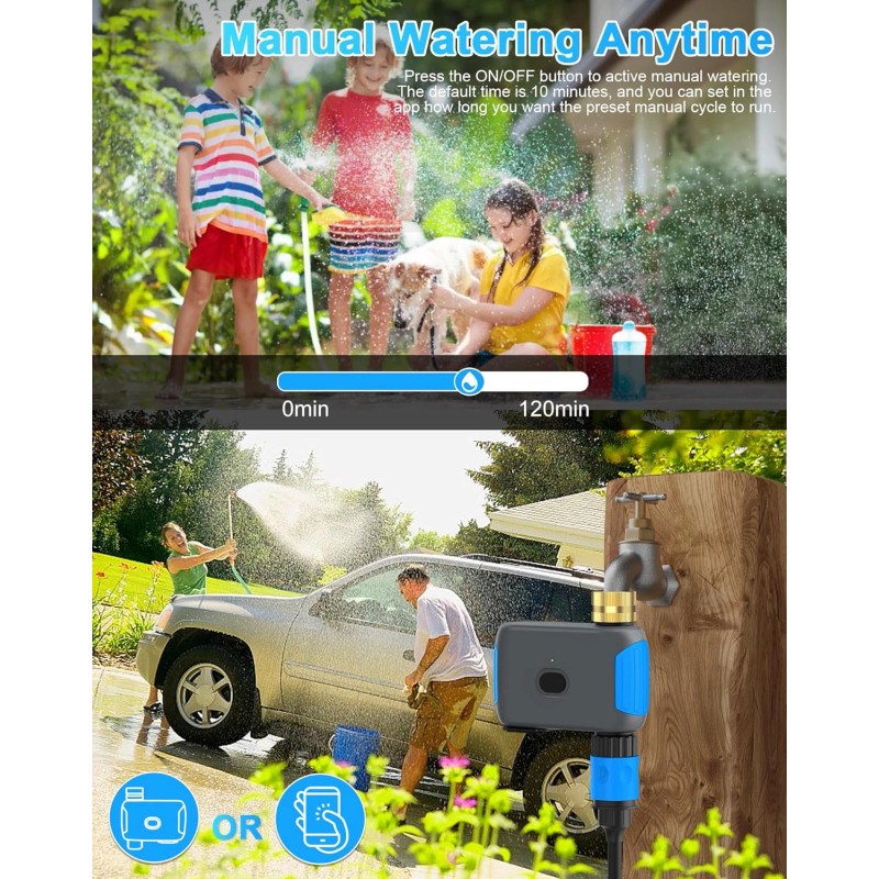 - Rain Delay & Manual Watering: Don’t let unexpected weather disrupt your watering plan. With the rain delay function, the Wi-Fi timer can delay your schedule to 24/48/72 hours via APP, ensuring your plants are not overwatered or underwatered. When you need to water temporarily, you can turn on the manual mode via the App according to your needs without affecting your set watering schedule.