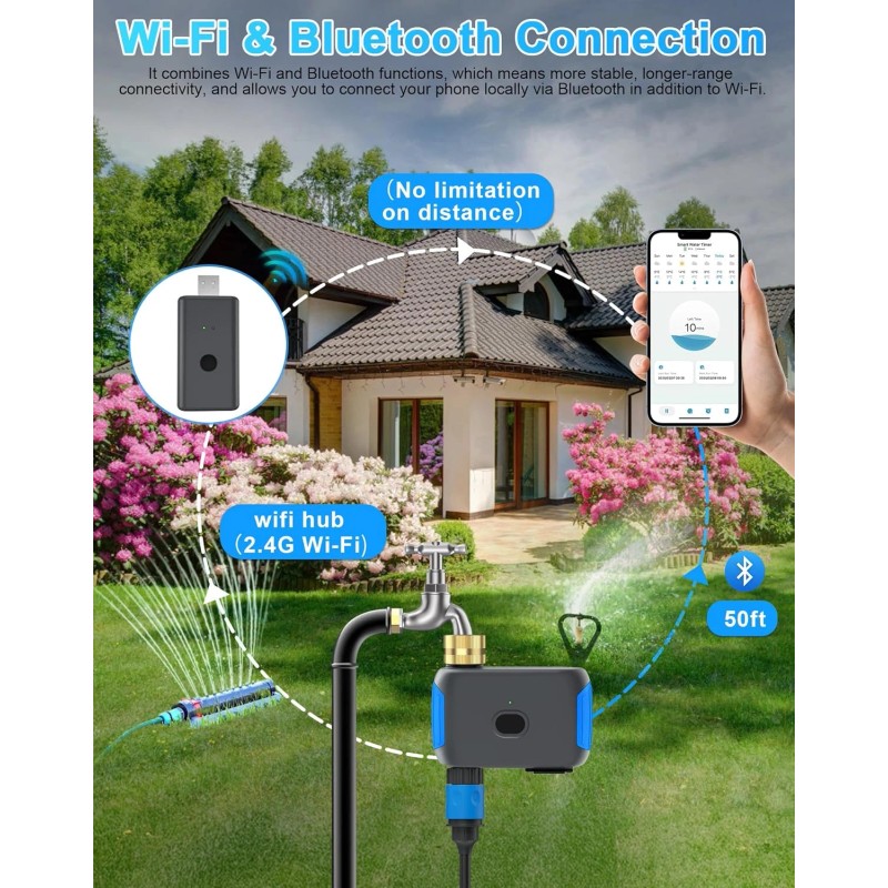 - WiFi & Bluetooth Connection: It comes with a Wi-Fi hub to facilitate connecting to your network which is especially useful if your outdoor faucet or hose bib is too far from your Wi-Fi router to get a good signal. You can manage your watering schedule even if you aren’t home, as long as your phone has access to the internet. It combines Wi-Fi and Bluetooth functions, which means more stable, longer-range connectivity, and allows you to connect your phone via Bluetooth(50ft) in addition to Wi-Fi.
