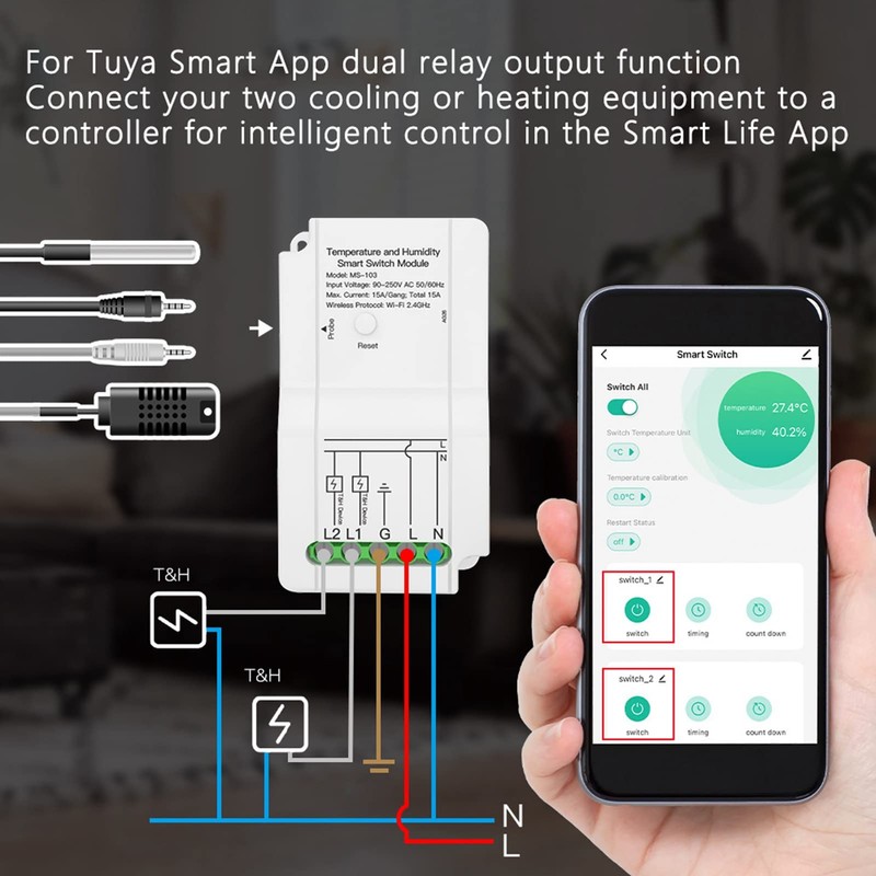 - Dual Relay Output: The controller support dual output, just connect your two cooling or heating equipment to a controller for intelligent control in the Smart Life APP.