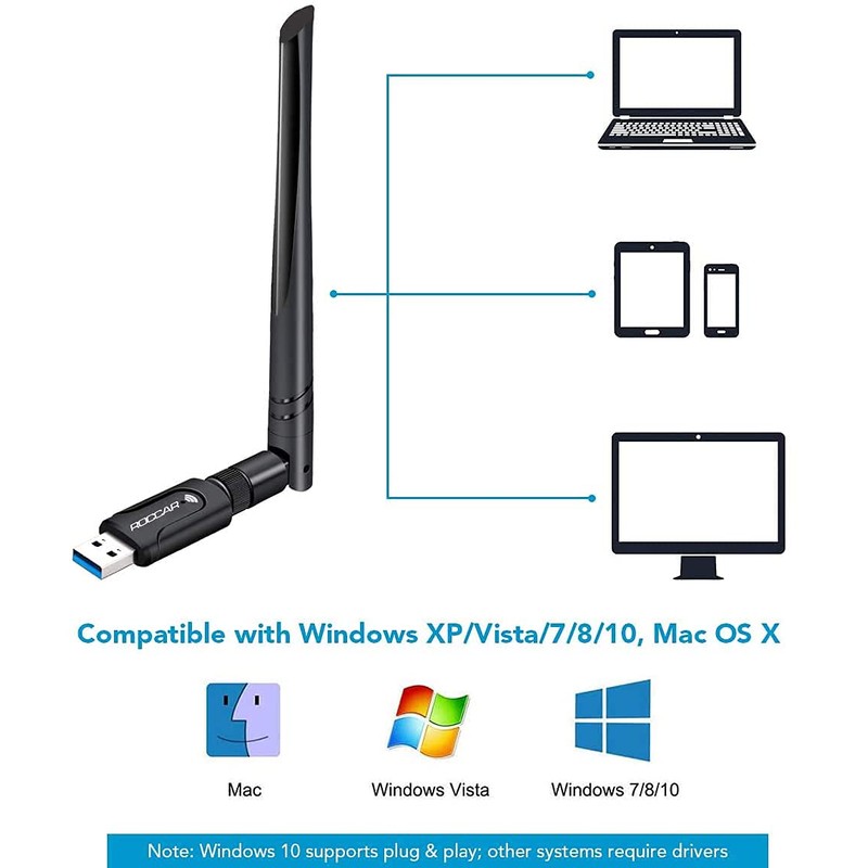 - 【Dual Band Wireless】Roccar WiFi adapter can receive WiFi signals on two separate bands with flexible connection, giving your devices access to the latest dual-band WiFi router for faster speed and extended range. The 5 GHz band is ideal for HD streaming and lag-free online gaming; the 2.4 GHz band is perfect for normal use, such as web surfing with legacy devices.