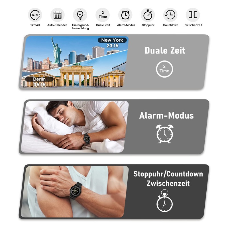 3. Sports watch functions: stopwatch, countdown, separate time, suitable for different sports venues that record every growth of you.
