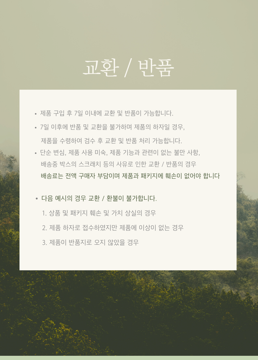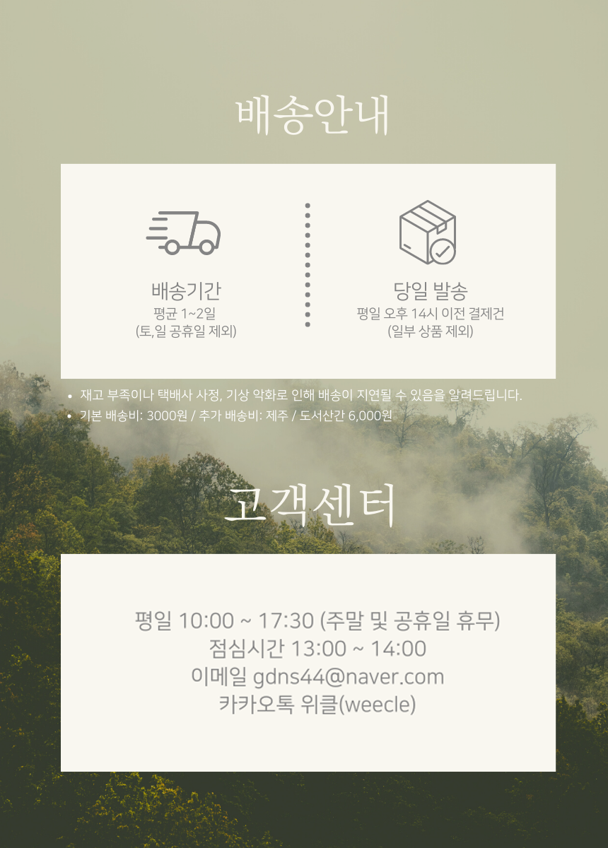 본 제품을 구매하시면 원활한 배송을 위해 꼭 필요한 고객님의 개인정보를 (성함, 주소, 전화번호 등) 택배사 및 제 3업체에서 이용하는 것에 동의하시는 것으로 간주됩니다.