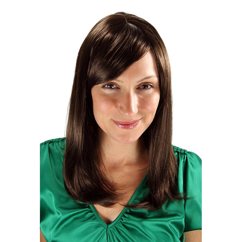 - Dark brown straight women's wig with parting and shoulder length hair.