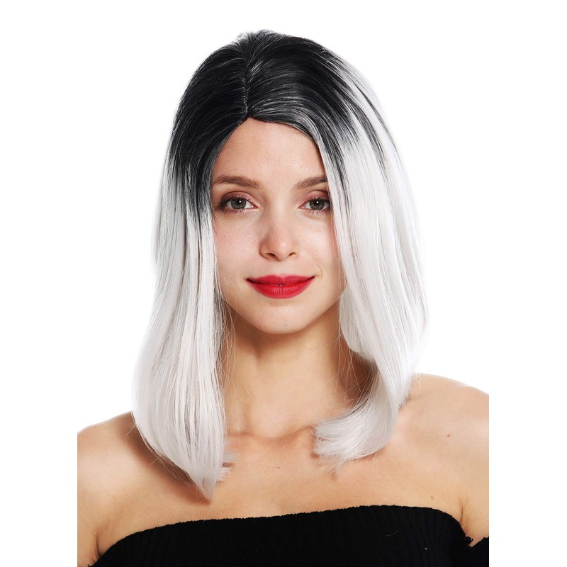 - Short, maximally sexy styled women's wig - the straight hair is parted in the middle and in a striking ombre mix of black hairline and very light grey in the tips.