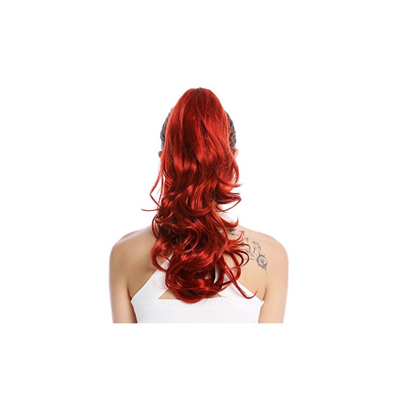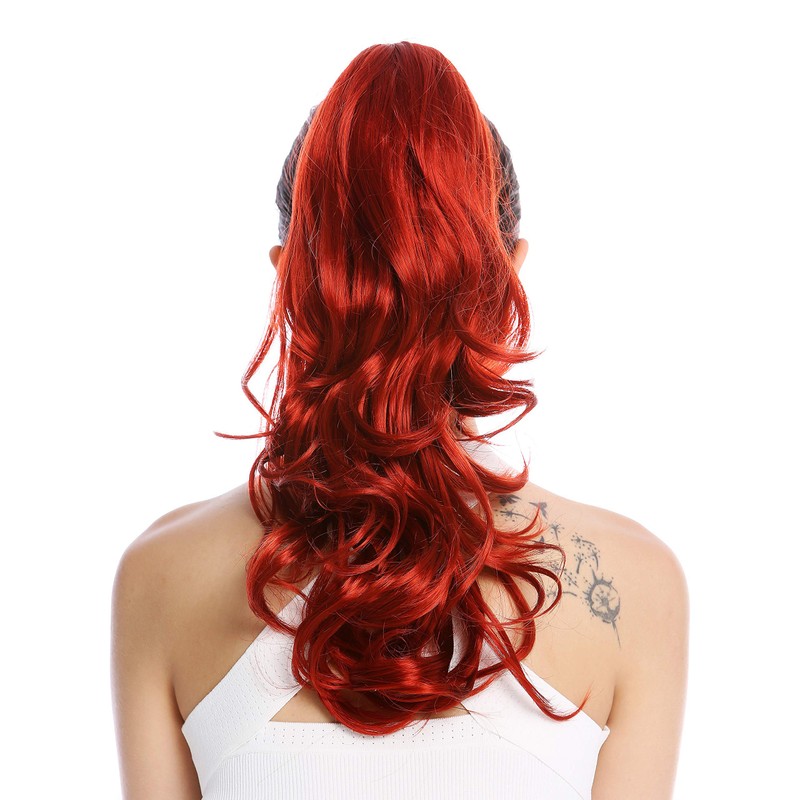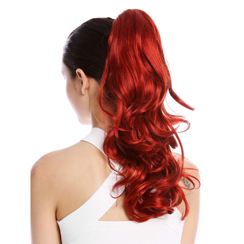 - Long, beautifully waved to slightly curled ponytail, available in various colours: this is a bright red.