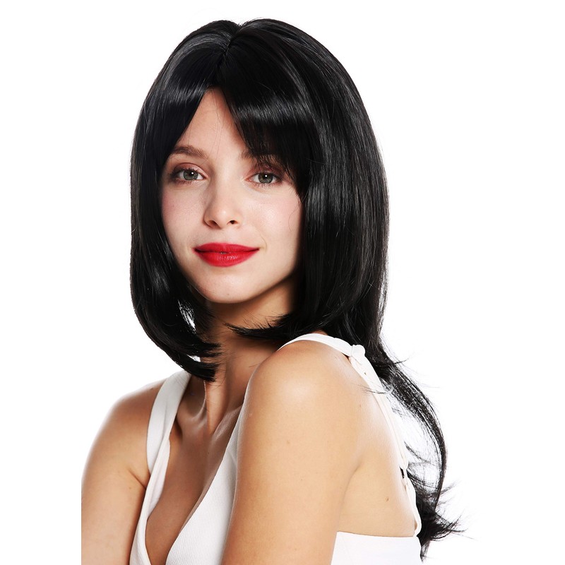 - Naughty layered medium length wig with a long parted fringe The model is available in various colours.