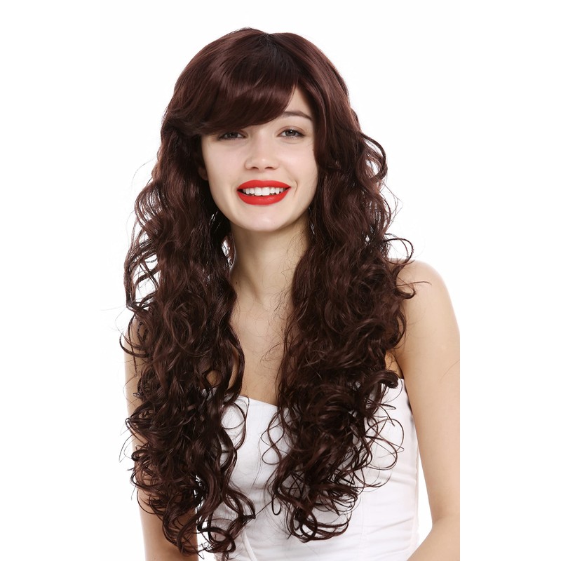 - Very long, beautifully lush curly women's wig in a wonderfully warm shimmering mahogany brown.