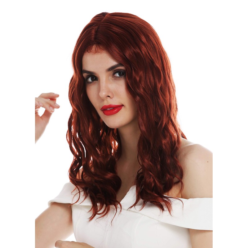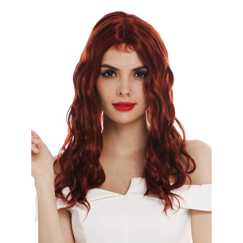 - Long, opulently styled, wavy women's wig with a middle parting. Cheeky, short hair is added to the hair line. This model is available in several colours, this one a copper red.