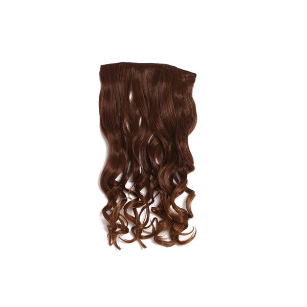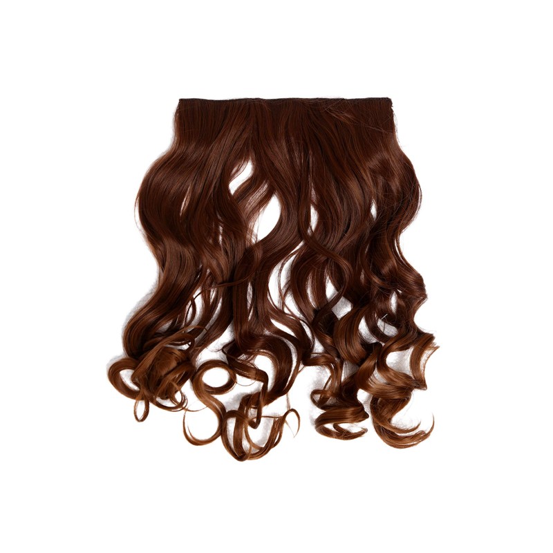 • Long (more than 20 cm) clip-in hair extension made of heat resistant curled fiber, held by 5 clips on a band 9,5 cm wide to cover the complete back of your head. Available in various colours and colour mixes. This is 33A130 - a vivid mahogany brown and auburn mix.