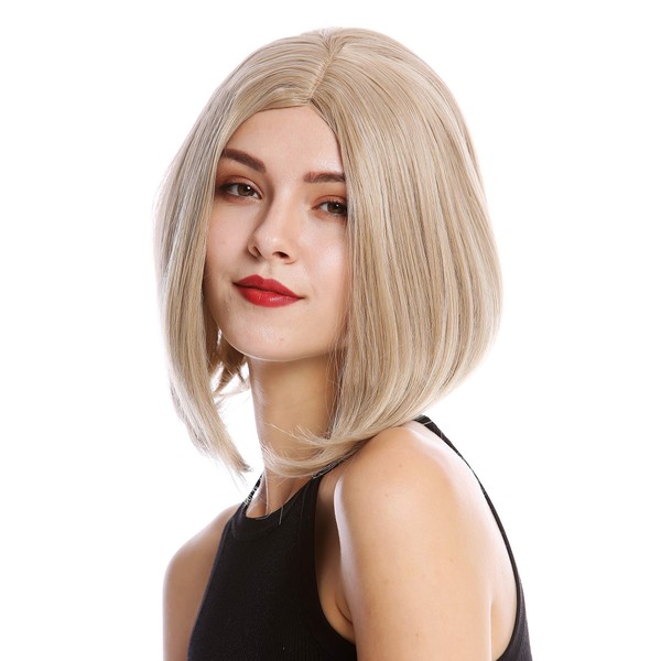 - Shoulder-length lady's wig with straight hair in a mixed of several blond hues, parted in the middle. The tips are slightly curved towards each other.
