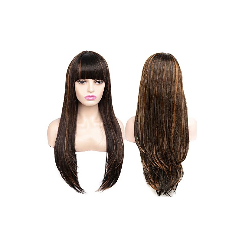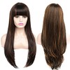 Wig with Bangs for Women Long Straight Wigs Synthetic Wig for Daily Play Party Black Mix Brown Hair Replacement for Girl Emo Cosplay Heat Resistant Synthetic Hair Wig 24 Inch (4/27)