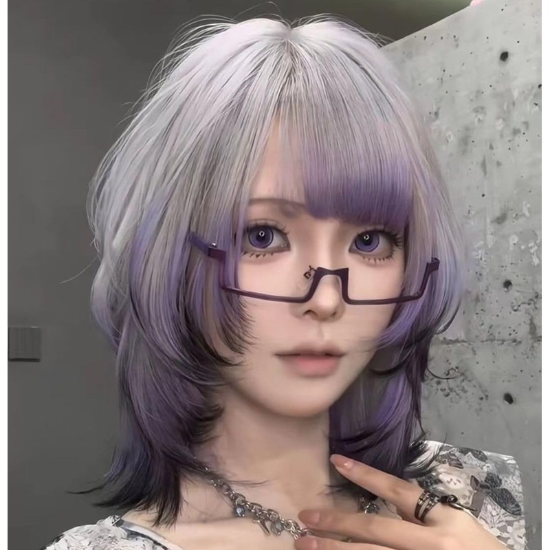 Wig, Wolf Cut, Semi-Long, Straight, Purple, Ash, Gradient, Medium Wig, Women's Wig, Curly Hair, Lolita, Harajuku Mesh, Imechen, Small Face, Natural, Heat Resistant, Everyday (Purple, Gray, Gradient