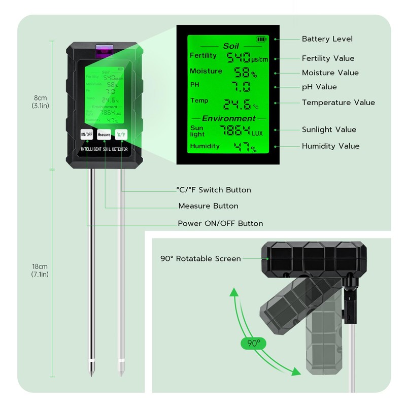 HD LCD Screen This soil tester is equipped with a large HD LCD screen, so that the test results are clearly readable in both bright and low light. Ideal for use in various environments, whether indoors, outdoors or in low light conditions.