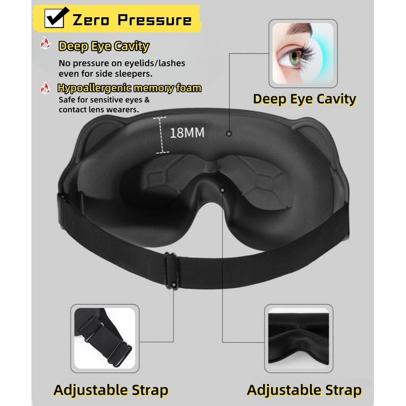 - Zero Pressure on Eyes & Eyelashes – Featuring deep eye sockets and an ergonomic 3D design, this contoured sleep mask allows your eyes to blink freely without any pressure. The no-pressure memory foam eye mask prevents discomfort and is ideal for side sleepers or those with sensitive eyes.