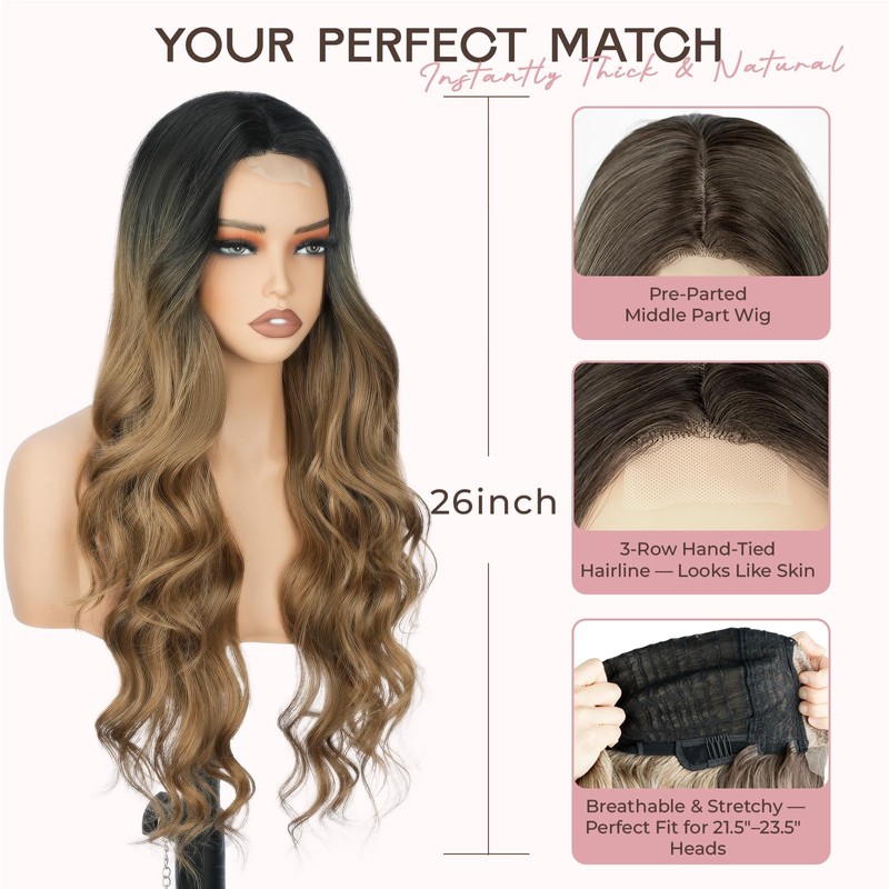 Wigs for Women Black to brown Wig Long Wavy Synthetic Wig with Natural Look, Heat Resistant Curly Hair for Daily Use