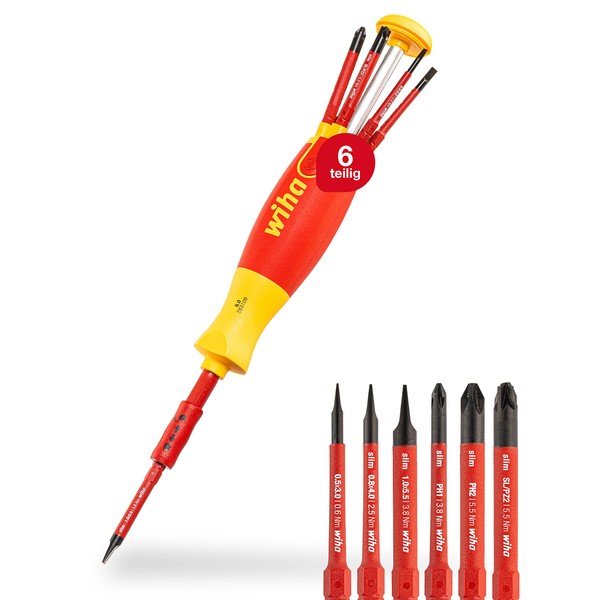 - 2 in 1 Screwdriver and Bit Set: The 6-piece bit set is located in the handle of the screwdriver and can be opened and removed by a simple push of a button. The Wiha slimBits ensure good and protected access to low-lying screws.
