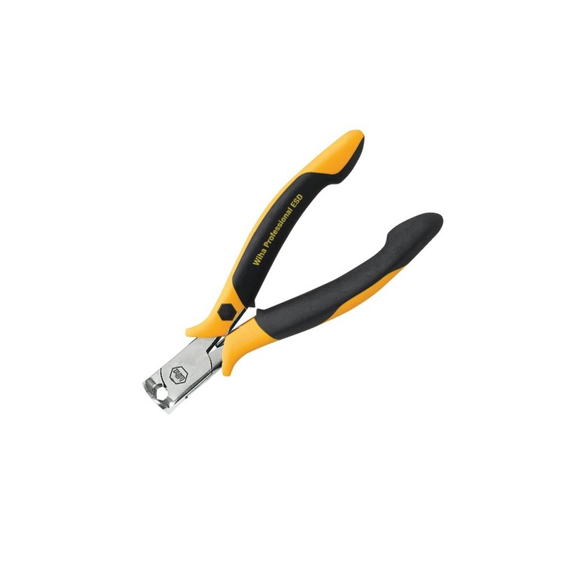 Wiha 32734 ESD safe precision end cutters, wide head, flush. End cutters drop- forged for an ideal material structure. Precise aligned cutting edges are additionally induction hardened at a hardness of approximately 64-Degree HRC. Two component non-slip grip handle, ESD safe dissipative. ESD standard IEC 61340-5-1.