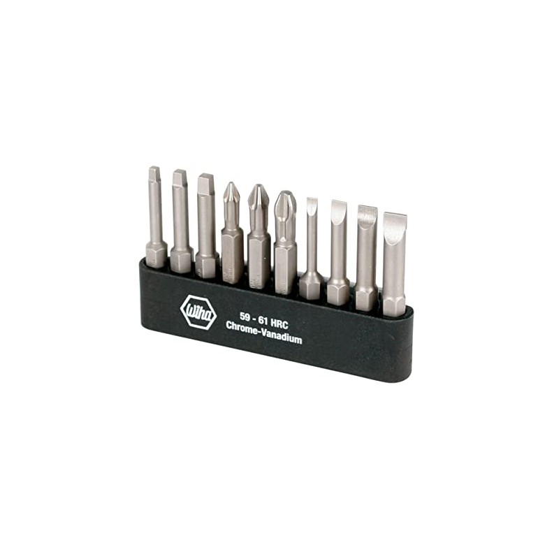 Wiha 74988 Power Bit Belt Pack with Slotted, Phillips & Square Bits. Ten piece set includes Slotted 3.0 mm, 4.5 mm, 5.5 mm and 6.5 mm. Phillips #1, #2 and #3. Square 1, 2 and 3 . Comes in molded holder with belt loop.