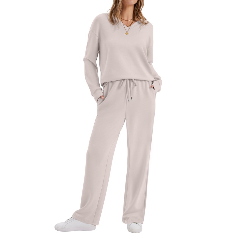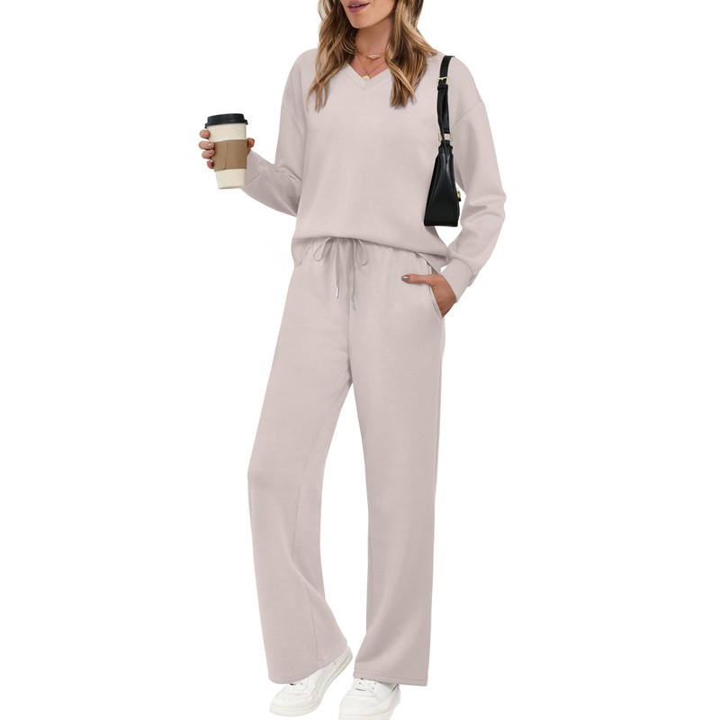 WIHOLL Lounge Sets for Women Two Piece Outfits Casual 2 Piece Sweatsuits Tracksuit Set Womens Fall Fashion 2025 Sweatpants Winter Clothing V Neck Sweat Set Loungewear Matching Sets Light Taupe L