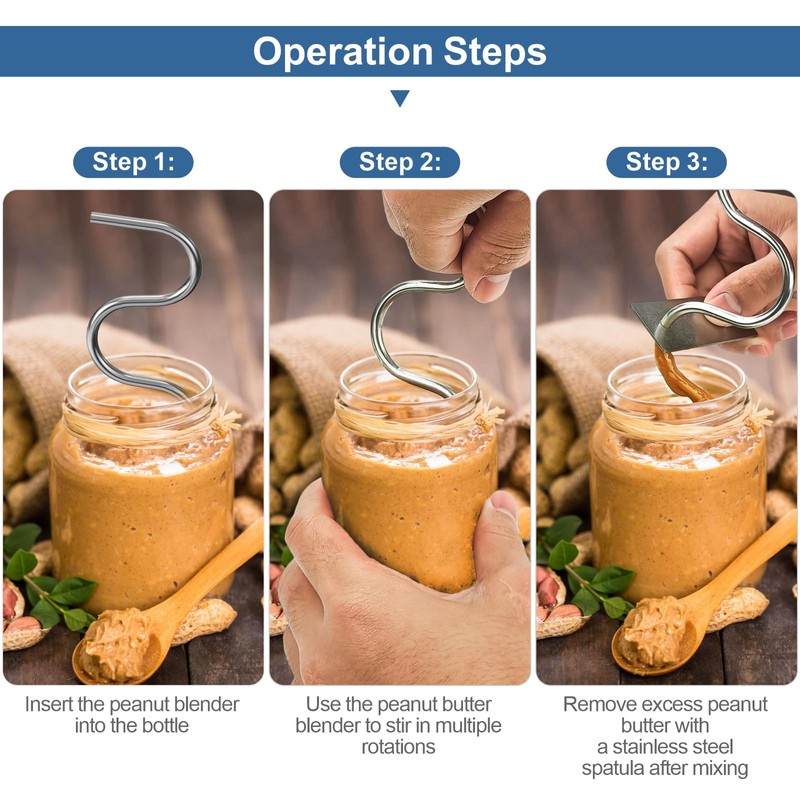 2.Crafted with precision, our peanut butter stirrer features a crank design with three curved surfaces, ensuring maximum stirring area inside the jar. This innovative design ensures your nut butter is thoroughly mixed, leaving no pockets of oil or clumps behind.