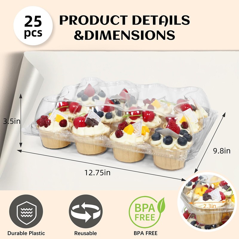 - Durable & Reusable 12 Count Cupcake Container: Crafted from BPA-free PET, our sturdy plastic cupcake containers resist twisting and bending. Designed for easy reuse, perfect for secure transport and storage of party treats