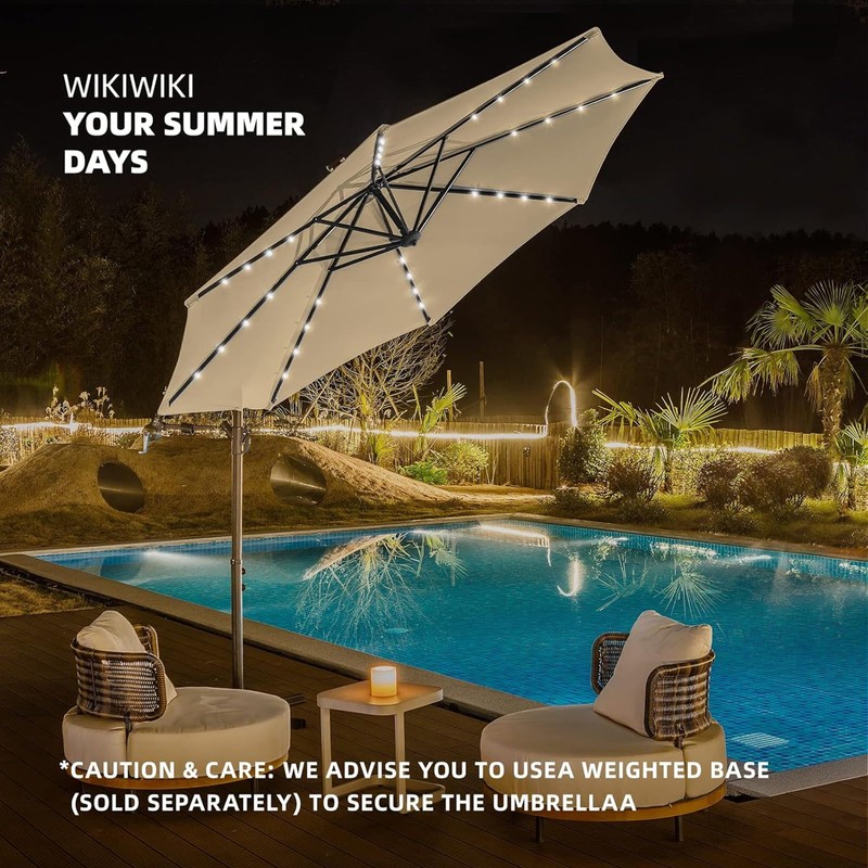 - TIPS & MAINTENANCE: This 10ft outdoor umbrella can NOT stand alone. It must be secured with a weighted base (SOLD SEPARATELY, SEARCH "B0DLMBJ4C4" OR "B0DPG1JNFT" FOR HEAVY DUTY BASE) or other weights (sandbags or bricks). In order to keep the cantilever umbrella with lights in pristine condition, we recommend closing the canopy when windy.