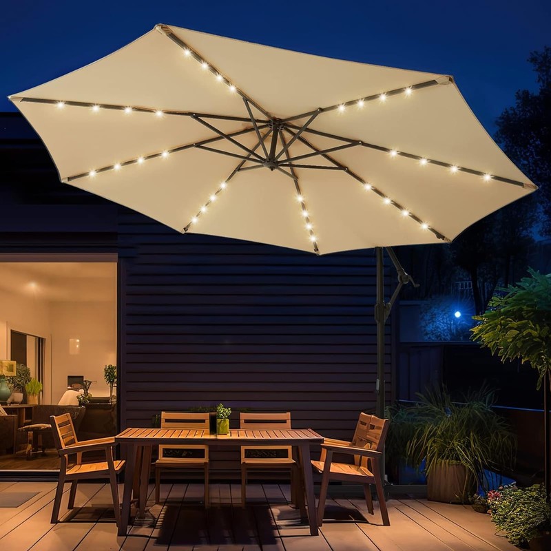 wikiwiki 10ft Solar LED Offset Hanging Market Cantilever Patio Umbrella for Backyard, Poolside, Lawn and Garden, Easy Tilt Adjustment, Polyester Shade & Cross Base, Beige