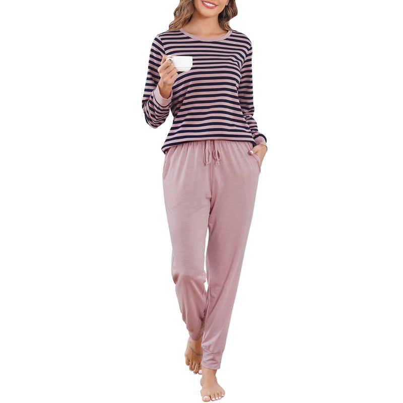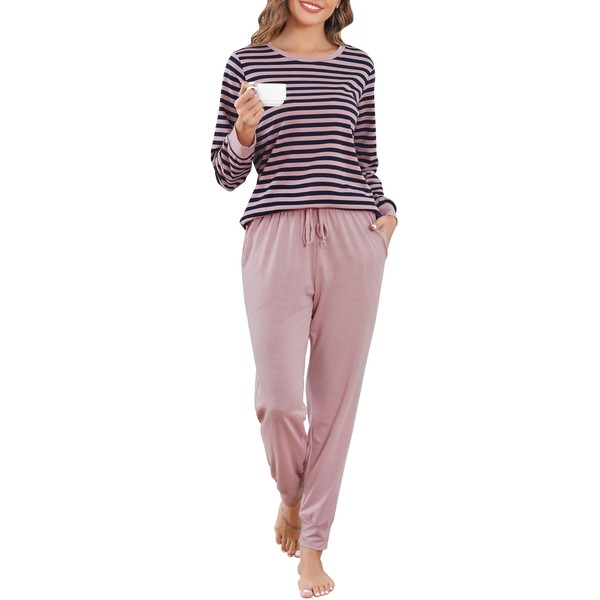 Wikoan Women Pyjamas Set Cotton Soft Pj's Sets Long Sleeve Striped Top and Solid Pants Sleepwear with Pockets Drawstring,Rose Pink,M