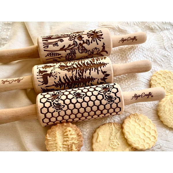 WILD 3 mini Embossed Rolling Pin Set with Bees, Meadow and Forest Patterns by Algis Crafts for Cookies and Pottery by Algis Crafts