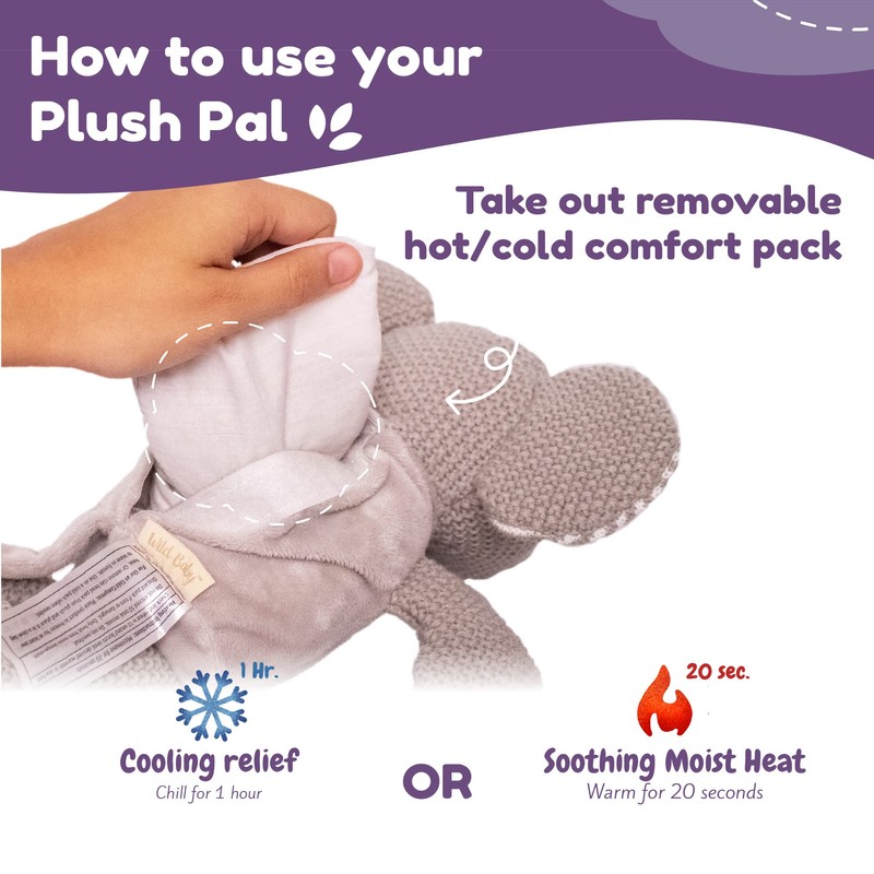 - Warmable Plush- This plush elephant comes with a removable therapy pack that can be used as a heating pad or placed in the freezer for cold therapy. Great for fevers, sprains, bruises, swelling, aches, pains, sinus pressure, bursitis, cramps, colic, and tendonitis. It is multipurpose and meets all US safety standards.