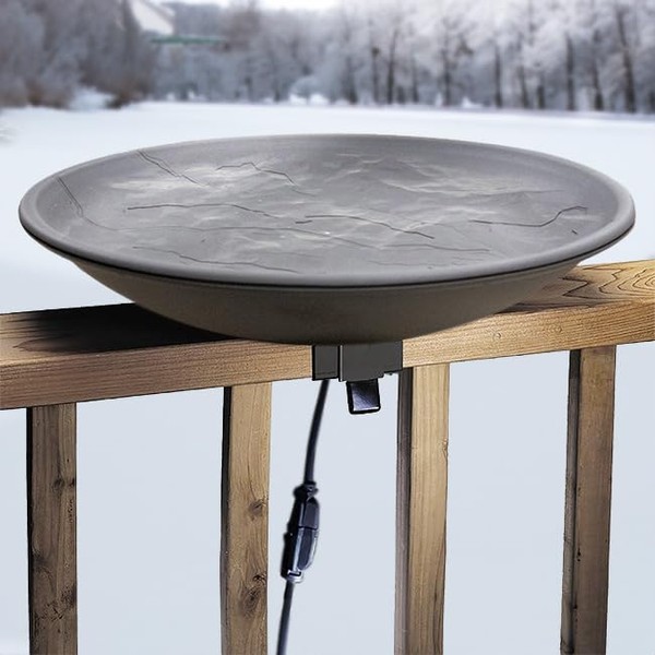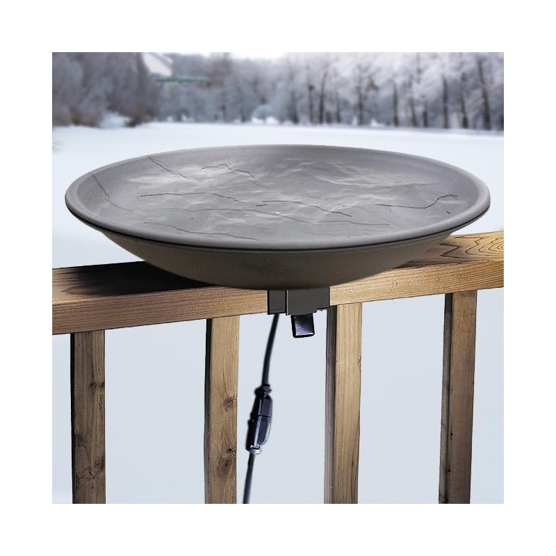 Installing a heated bird bath on your deck rail allows birds to remain healthy and vital through all different seasons, while you watch their antics up close. This sturdy, 20” diameter heated bowl provides ample space for birds to bathe and rejuvenate, while the 0.25” thick rim lends plenty of perching area. A 2” basin depth offers an ideal destination for small birds to safely wash and preen. A heating element rests below the middle of the basin, utilizing 150 watts of power to help you ensure an ice-free bath in cold weather. The basin’s texture and color give the appearance of cut slate, offering a natural and striking look while creating a slip-free landing surface. An internal temperature regulator automatically turns the heater on and off, ensuring water remains at an optimal temperature that won’t harm birds or other animals. The included deck mounting hardware allows you to easily connect this bird bath to your wooden, horizontal deck rail. Bath may also be placed on a pole or pedestal (not included) for an eye-catching display. Deck bracket design allows the bowl to tilt upward to drain old water, for easily cleaning and refilling it. Mounting bracket assembly required. One year limited warranty.