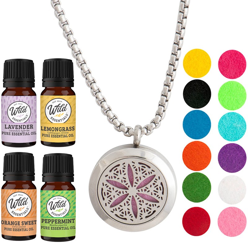 Wild Essentials Flower of Life Necklace Personal Aromatherapy Diffuser Gift Set, Made in USA Pure Essential Oils, Lavender, Peppermint, Lemongrass, Orange Stainless Steel, Refill Pads