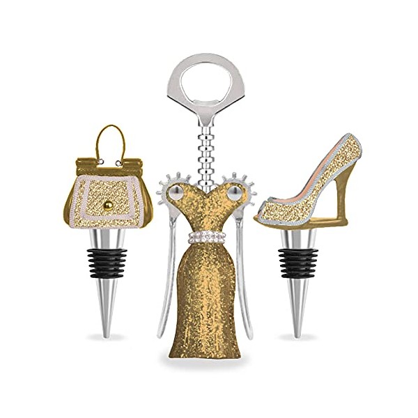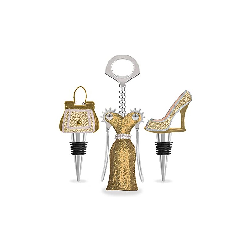 WILD EYE DESIGNS Fashion Wine Set - 3PCS. Winged Corkscrew, HIGH Heel & Purse Wine Stoppers. Silver Glitter