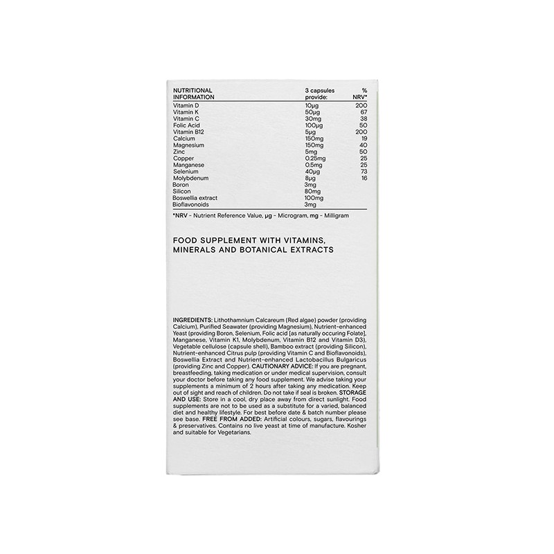 Lithothamnium Calcareum (Red algae) powder (providing Calcium), Purified Seawater (providing Magnesium), Nutrient-enhanced Yeast (providing Boron, Selenium, Folic acid [as naturally occuring Folate], Manganese, Vitamin K1, Molybdenum, Vitamin B12 and Vitamin D3), Vegetable cellulose (capsule shell), Bamboo extract (providing Silicon), Nutrient-enhanced Citrus pulp (providing Vitamin C and Bioflavonoids), Boswellia Extract and Nutrient-enhanced Lactobacillus Bulgaricus (providing Zinc and Copper).