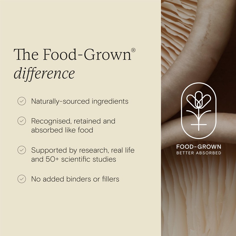 - WHY FOOD-GROWN SUPPLEMENTS? Your DNA is wired to receive nutrition from food, which is exactly why Food-Grown ingredients are kept as close to their original food form as possible. No added fillers or binders, just clean, ethically sourced ingredients, evidenced by research and real life. Five gold-standard scientific absorption studies show just how effectively Food-Grown supplements are absorbed and retained. Let your body decide.