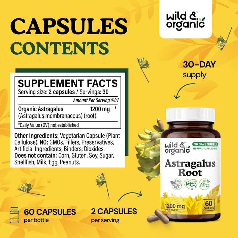 - Immune Support: Each serving of Wild & Organic astragalus capsules contains 1200 mg of astragalus powder for immune support.