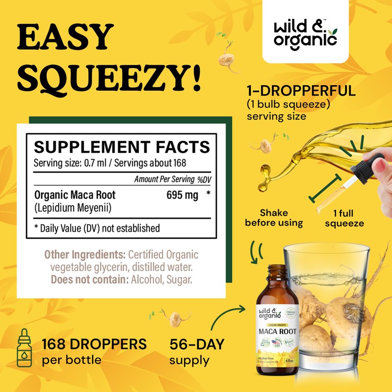 • 56-Day Supply: Each 4 fl. oz. bottle of Wild & Organic maca drops contains 168 servings per bottle, providing a 56-day supply when taken three times per day.
