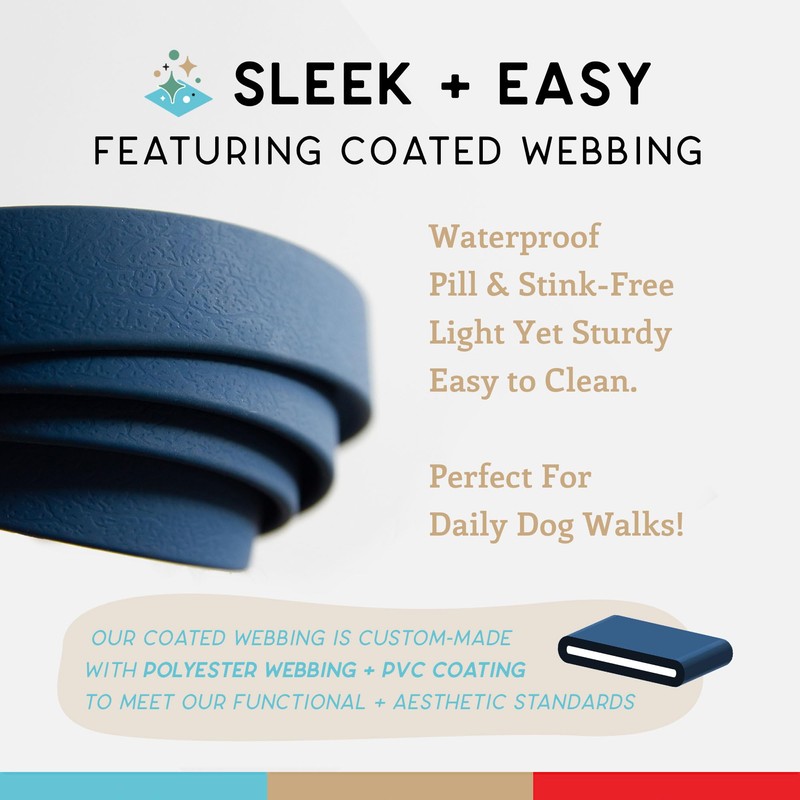 One of the key elements that sets our leash apart is the use of coated webbing which we've invested countless hours sampling, tweaking and perfecting to our exact specifications. The 1000D nylon reinforced handle and a secure swivel snap hook were then added to support the ideal balance of strength, thickness, stiffness, texture, and color that we’ve achieved with our coated webbing. The finished product is a tastefully put together, durable and comfortable leash that is sure to deliver exceptional performance and reliability on all your dog walks and adventures beyond!