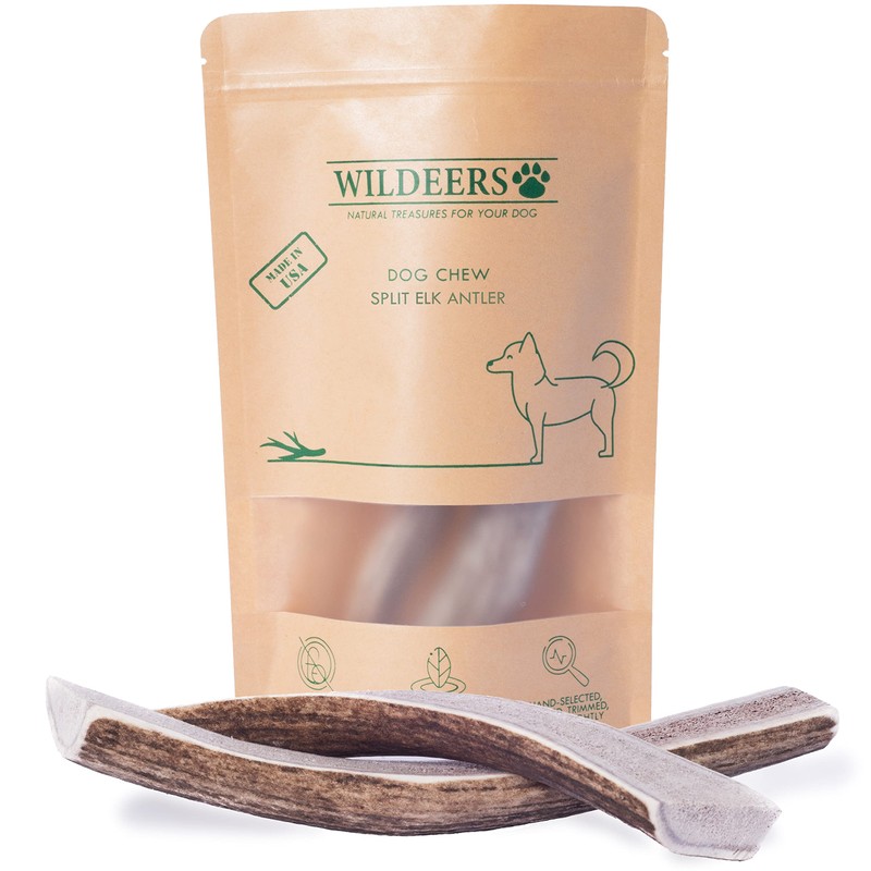 Wildeers Split Elk Antlers for Dogs Large, 2-Pack, Made in USA, Grade A Antler Dog Chew Bones for Medium and Large Breeds, 7+ inch Long, Naturally Shed, Healthy Treat