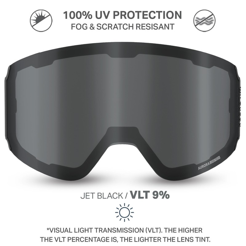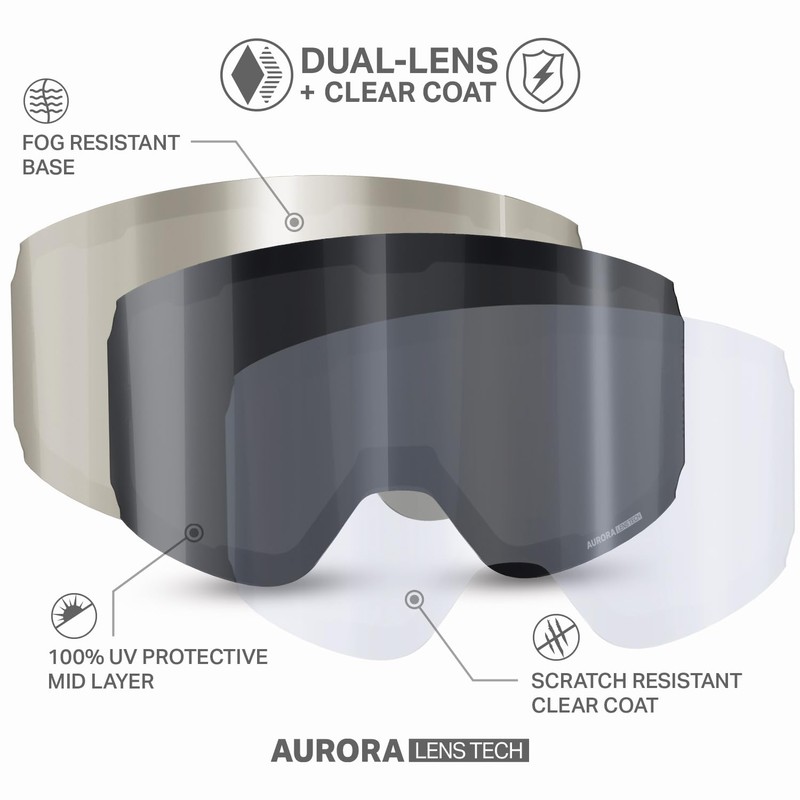 • AURORA LENS TECHNOLOGY: Don't ruin your skiing or snowboarding trip with a sub par lens. Our WIDE VIEW panoramic spherical dual lens design with premium Anti-Fog & Anti-Scratch coating allow you to see the terrain in any light condition without distortion while also protecting your eyes from glare and harmful UV rays