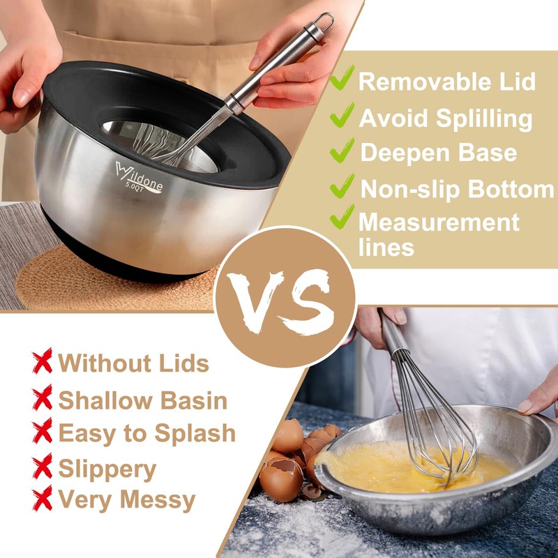 - 🍒【Easy To Measure & Non-slip】Quarts and liters are engraved inside the bowls and fade proof, meet the demand of different measurement. The non-slip silicone bottom keeps the stainless bowls steady on counter tops when beating and whisking. You can mix, beat, or whisk ingredients with little mess as the wide, deep bowls have high walls to prevent splatter.