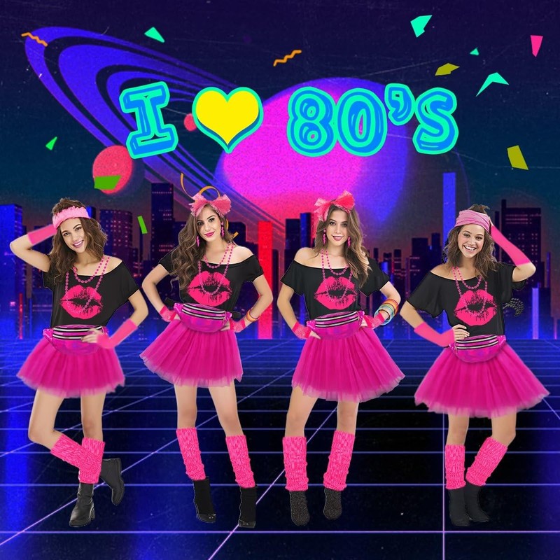- 80s Women's Accessories Set: This includs 1 print T-shirt, 1 tutu skirt, 1 neon fanny pack, 1 pair of fingerless short fishnet gloves, 1 pair of fingerless long fishnet gloves, 1 pair of leg warmers, 2 neon necklaces, 1 lace headband,1 pair of flash earrings, 10 neon silicone bracelets