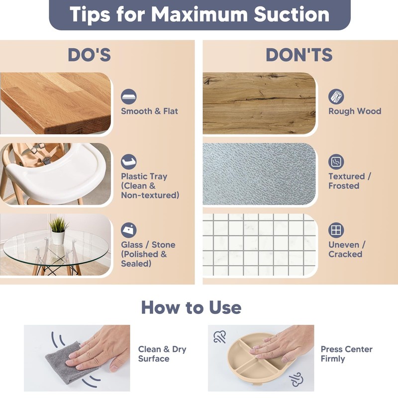 - SUCTION BASE: Strong suction cup bottom keeps plate firmly attached to table or high chair tray, preventing spills and messes