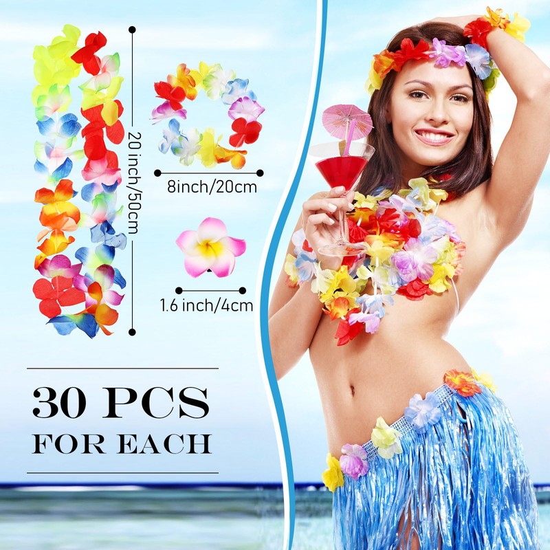 - Rich Luau Party Costume Set: you will get 30 tropical hula skirts, 30 Hawaiian flower leis, 30 Hawaiian flower wristband and 30 plumeria hair clips, abundant quantity to meet your party needs, such a nice costume set that can light up your party